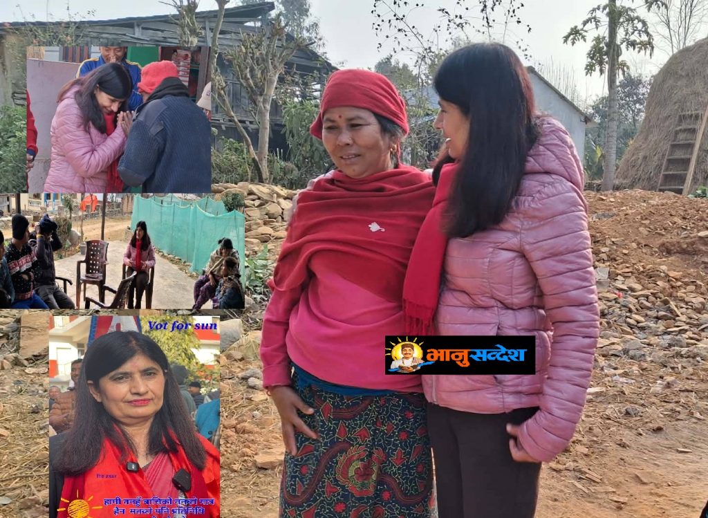 तनहुँ जिल्ला प्रतिनिधिसभा निर्वाचन क्षेत्र नं. १ मा नेकपा एमालेकी तर्फबाट उम्मेदवार भगवती न्यौपानेले आफ्नो जन्मगाउँ भानु नगरपालिका–७ र ८ बाट घरदैलो अभियान सुरु गरेकी छन्।