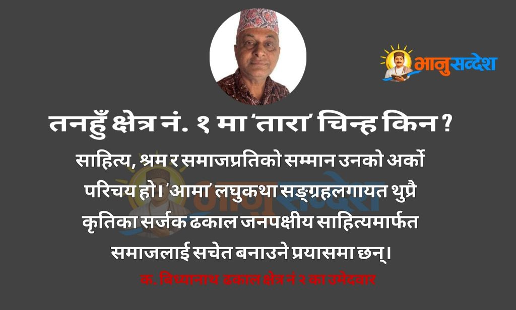 यही सन्दर्भमा नेपाल कम्युनिष्ट पार्टी (नेकपा)काे तारा चिन्हका उम्मेदवार विद्यानाथ ढकाल एक फरक, स्पष्ट र भरोसायोग्य विकल्पका रूपमा देखिन्छन्। भानु नगरपालिका–४ का स्थायी बासिन्दा ढकाल दशकौँदेखि भ्रष्टाचार, बेथिति र विकृतिविरुद्ध सुशासनको पक्षमा निरन्तर आवाज उठाउँदै आएका अग्रणी राजनीतिक तथा सामाजिक व्यक्तित्व हुन्। सत्ता र सुविधाभन्दा सिद्धान्त र जनताको साथ रोज्ने उनको जीवनशैलीले नै उनलाई अरूभन्दा अलग बनाएको छ।