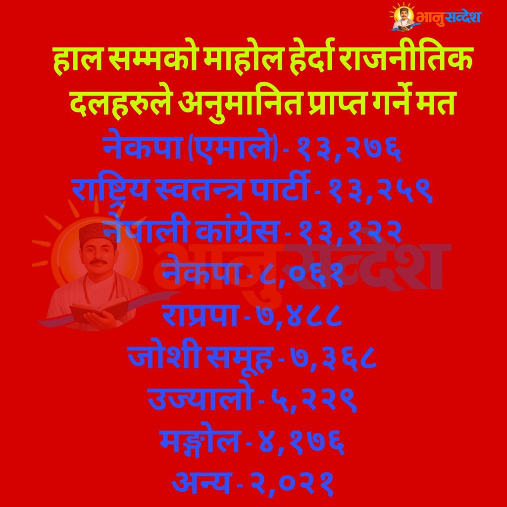 अनुमानित आकडा अनुसार नेकपा (एमाले) ले १३,२७६ मत प्राप्त गर्ने अनुमान गरिएको छ भने उनलाई पछ्याउँदै राष्ट्रिय स्वतन्त्र पार्टी (रास्वपा) ले १३,२५९ मत ल्याउने देखिन्छ। यस्तै, नेपाली कांग्रेस पनि यो रेसभन्दा टाढा छैन; कांग्रेसले १३,१२२ मत पाउने अनुमान गर्न सकिन्छ।