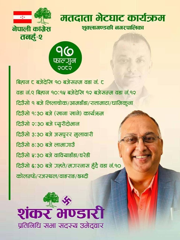 तनहुँ–२ मा प्रतिनिधिसभा सदस्यका उम्मेदवार शंकर भण्डारीले १७ फागुन २०८२ मा मतदाता भेटघाट कार्यक्रम गर्ने भएका छन्। नेपाली कांग्रेस तनहुँ–२ को आयोजनामा शुक्लागण्डकी नगरपालिकाका विभिन्न वडामा दिनभरि भेटघाट कार्यक्रम तय गरिएको हो। बिहान ८ बजेदेखि १० बजेसम्म वडा नं. ८ र १० मा कार्यक्रम रहने जनाइएको छ।