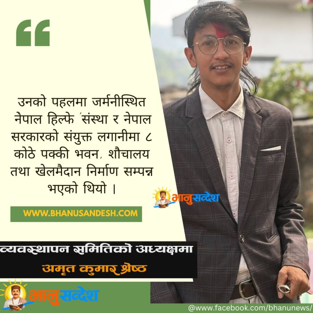 उनको पहलमा जर्मनीस्थित ‘नेपाल हिल्फे’ संस्था र नेपाल सरकारको संयुक्त लगानीमा ८ कोठे पक्की भवन, शौचालय तथा खेलमैदान निर्माण सम्पन्न भएको थियो, जसले विद्यालयको शैक्षिक वातावरण सुधारमा महत्वपूर्ण योगदान पुर्याएको छ। नवनिर्वाचित अध्यक्ष श्रेष्ठले आफ्नो कार्यकालमा शैक्षिक गुणस्तर सुधारलाई प्राथमिकतामा राख्ने बताएका छन्। विद्यार्थी संख्या वृद्धि गर्दै विद्यालयलाई भानु नगरपालिकाकै नमुना शैक्षिक संस्थाका रूपमा विकास गर्ने उनको लक्ष्य रहेको छ।